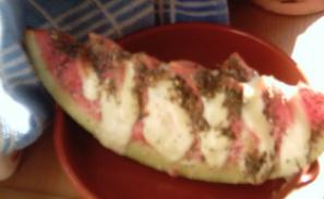 - Pour vinegar and salt over the red parts of the watermelon. Let it stay for a while. Make cuts from the upper part of the melon to the skin, but dont cut the skin. Chop the mozzarella in discs, place these discs in the cuts you have made. Spice up with thyme, ginger and maw-seed.