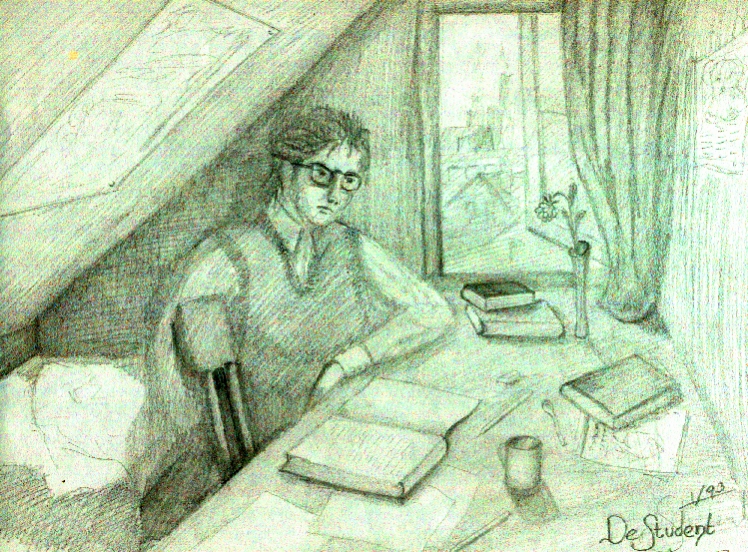 An oldie self-portrait. The room resembles the attic I lived in, but is not "copied" - the bed was the other way around, and the roof was folded the other way. It's about how I long to be outside instead of learning from them empty books in this small, impossible sized attic.