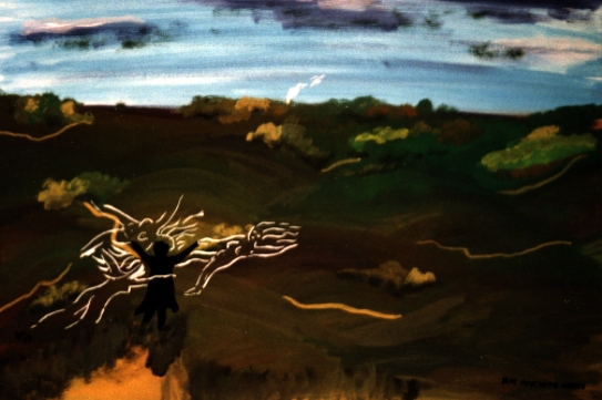 During a hike over the dutch mountains at sunset, I saw this landscape. It was the perfect landscape for the legend of the Witte Wieven (White Women, litt.) and back home, I painted them in the landscape.
